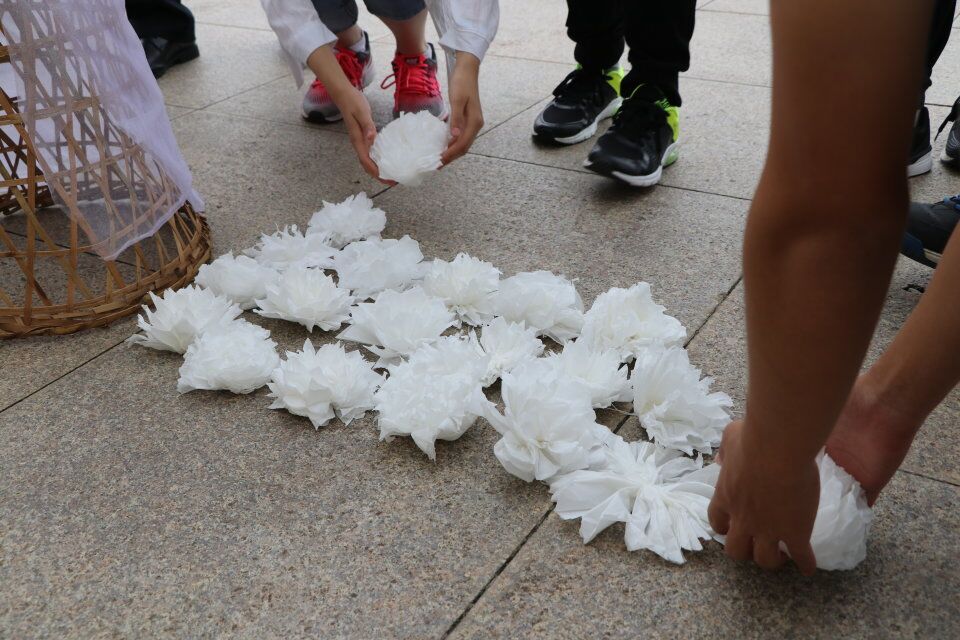 首先进行的是为革命先烈祭献白花的活动。为此支部的团员们特意于前一日晚上亲手制作纸花。其中部分团员反复尝试,力求完美,用精心细致的制作表达对先烈们的崇高敬意。