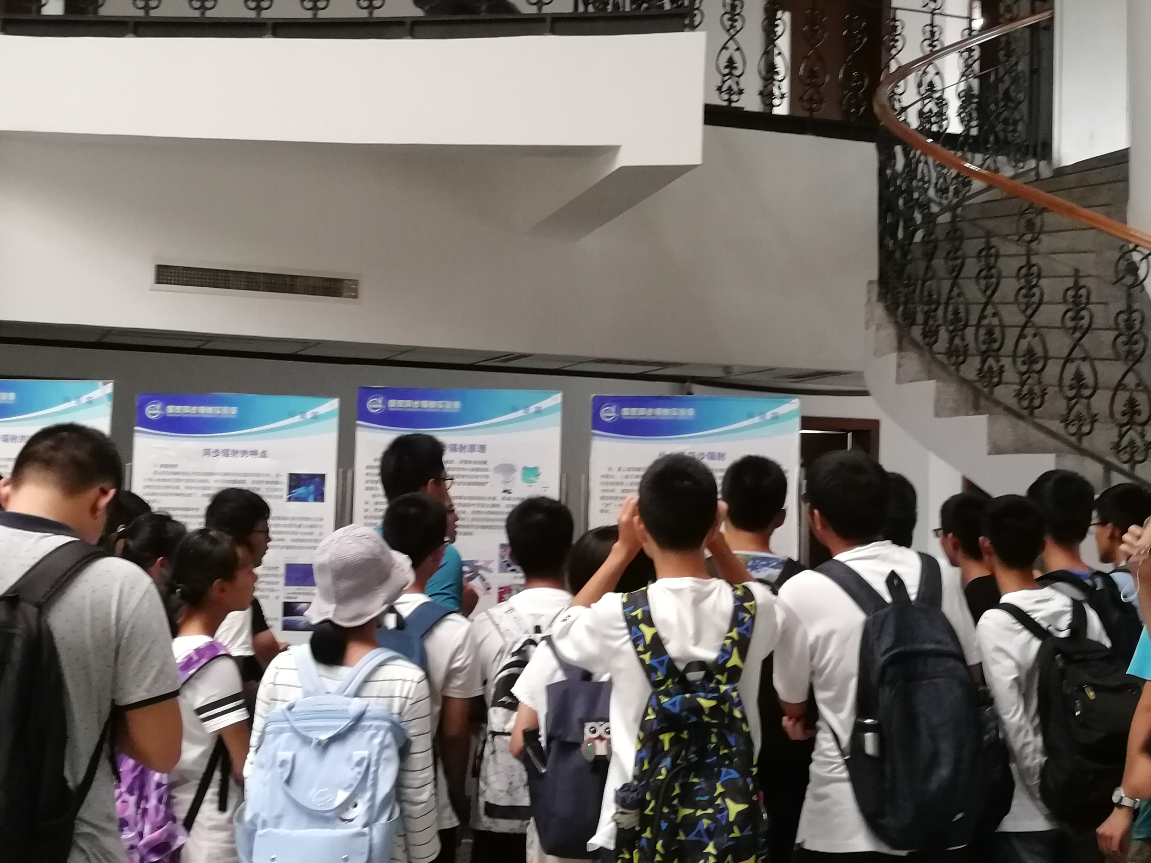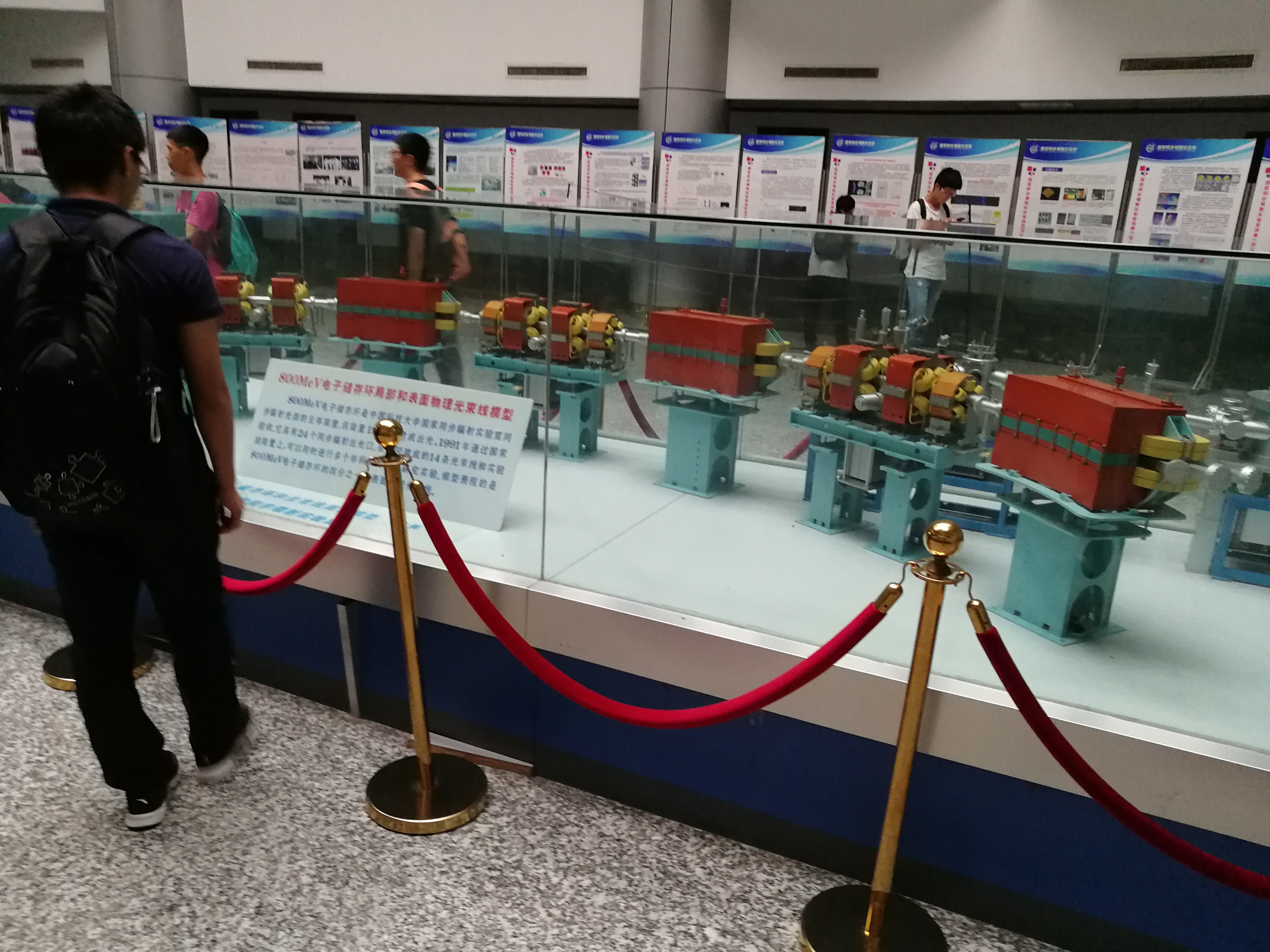 很快,2班同学到达展览馆。一位在职博士学姐百忙中抽空,热情地为我们讲解了同步辐射的原理,并介绍了展出的200MeV电子直线加速器模型和800MeV电子储存环局部模型。同学们饶有兴趣地聚在学姐身旁,认真听着解说,并时不时提出问题。