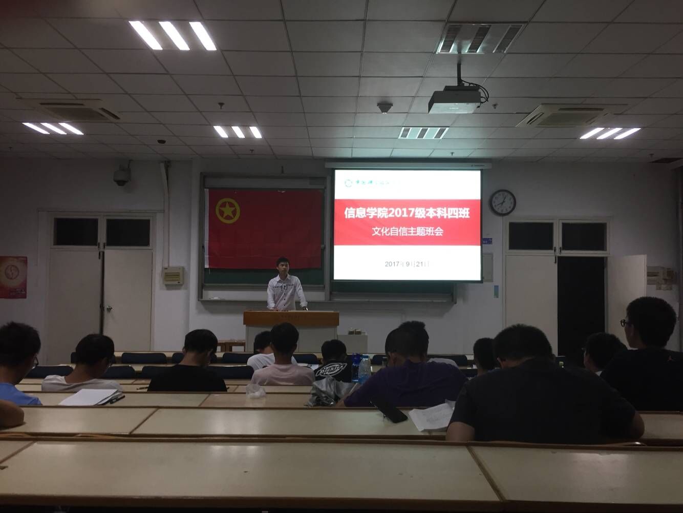 为增强全体团员文化自信,应信息学院团委要求,2017年9月21日晚,信院2017级四班在3C304教室召开关于学习文化自信主题班会,四班全体同学参加了本次班会。