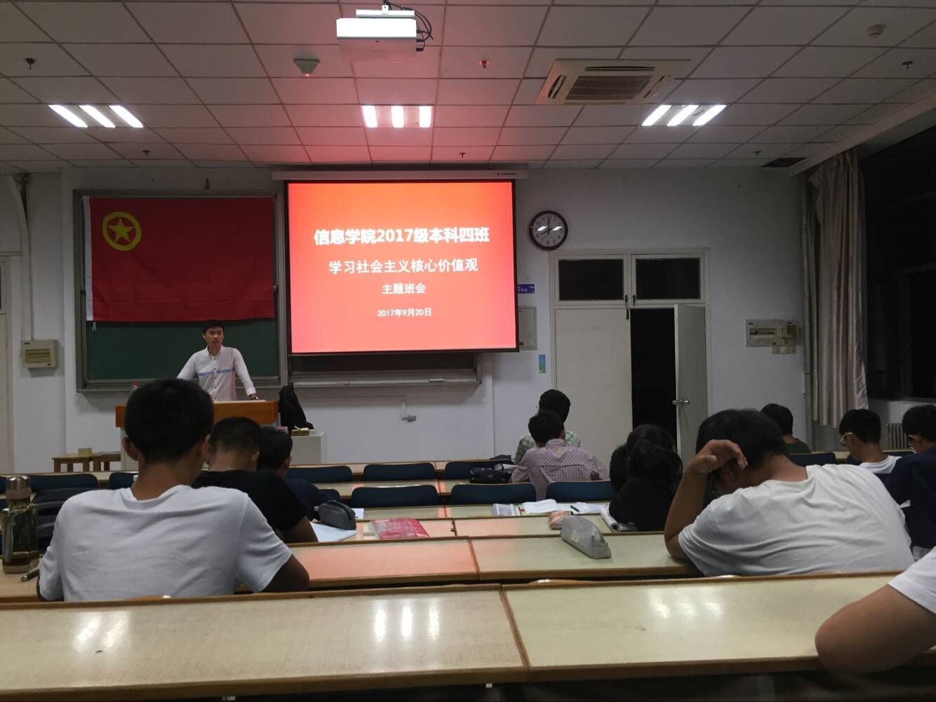 党的十八大报告提出,倡导富强、民主、文明、和谐,倡导自由、平等、公正、法治,倡导爱国、敬业、诚信、友善,积极培育社会主义核心价值观。为了更好地践行社会主义核心价值观,9月20日晚,在信息学院团委的大力支持下,信息学院2017级四班召开了践行社会主义核心价值观主题班会,班级全体同学参加了本次主题班会。