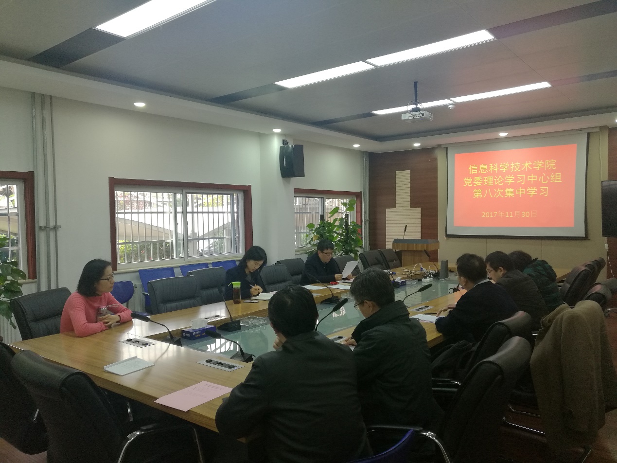 2017年11月30日上午10:00,信息学院党委理论学习中心组在电二楼102会议室集中学习了党的十九大精神。集中学习由党委书记陈卫东主持,学院党委委员和列席人员参加了本次学习。